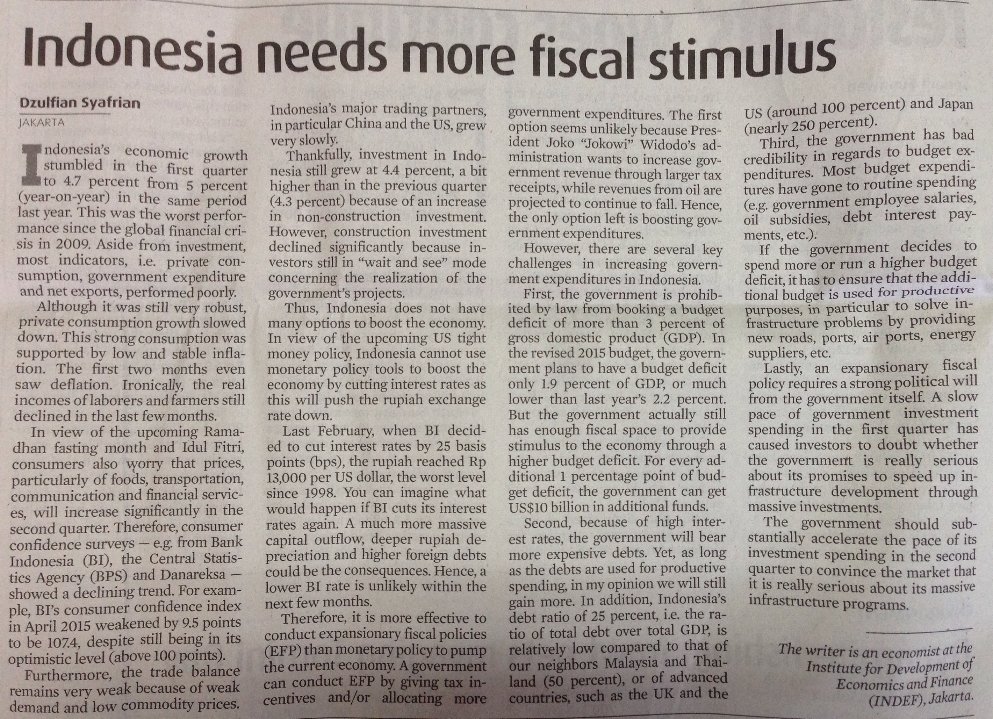 The writer is an economist at the Institute for Development of Economics and Finance (INDEF), Jakarta. – See more at: http://www.thejakartapost.com/news/2015/05/28/indonesia-needs-more-fiscal-stimulus.html#sthash.VQw9CpsB.dpuf