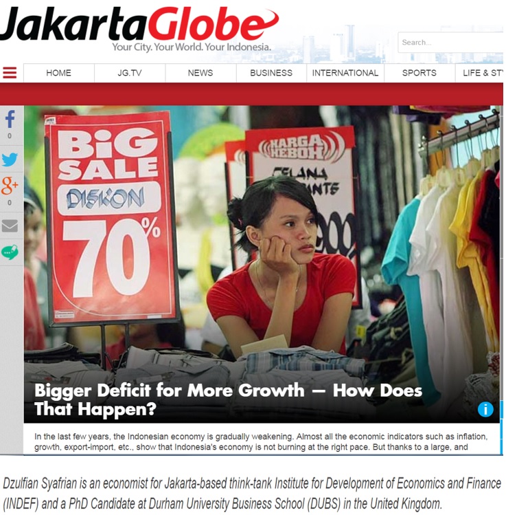 Dzulfian Syafrian is an economist for Jakarta-based think-tank Institute for Development of Economics and Finance (INDEF) and a PhD Candidate at Durham University Business School (DUBS) in the United Kingdom.