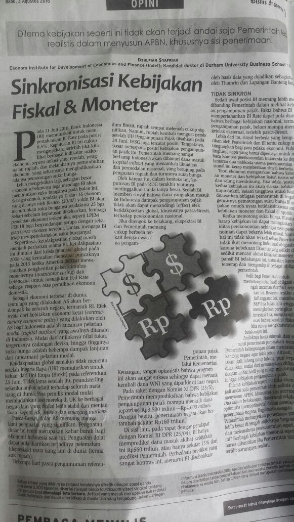 Sedari awal posisi BI memang lebih moderat dibanding Pemerintah dalam melihat kebijakan pengampunan pajak. Fakta bahwa BI mempertahankan BI Rate dapat pula diartikan bahwa berbagai kebijakan nasional, termasuk pengampunan pajak, belum mampu meredam gejolak eksternal, terlebih pasca-Brexit. Lebih dari itu, sinyal berbeda yang kerap diberikan oleh Pemerintah dan BI tentu cukup membingungkan bagi para pelaku ekonomi.