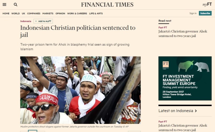 - Financial times : Jakarta’s Christian governor Ahok sentenced to two years jail